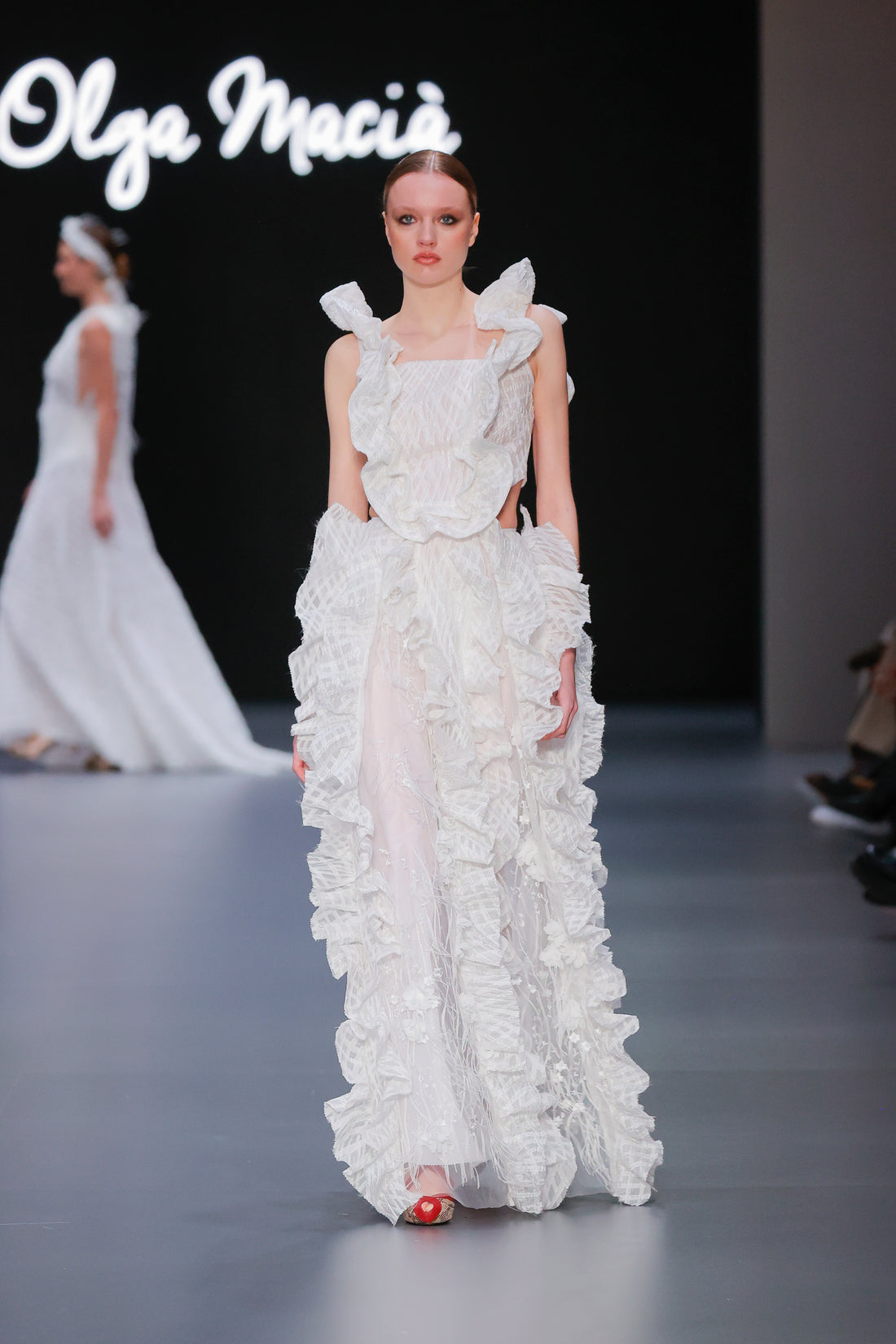 Vestido de novia con volantes dos piezas, con tejido fantasía. Contactar para tallas adicionales....